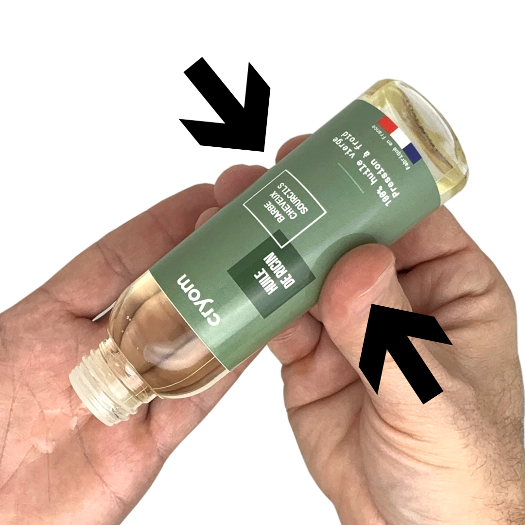Voici quelques conseils pour bien utiliser l'huile à barbe cryom. A froid, l’huile de Ricin est épaisse et sirupeuse. Pour faciliter son application, je passe le flacon fermé sous l’eau chaude pour la fluidifier.