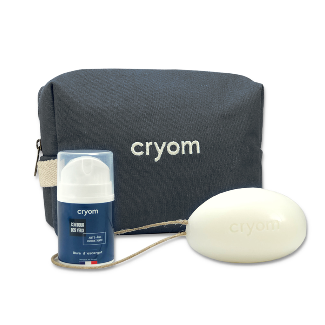 La routine comprend 3 produits cryom : La trousse de toilette WEEK-END + la crème visage spéciale contour des yeux + le savon galet à la bave d'escargot.